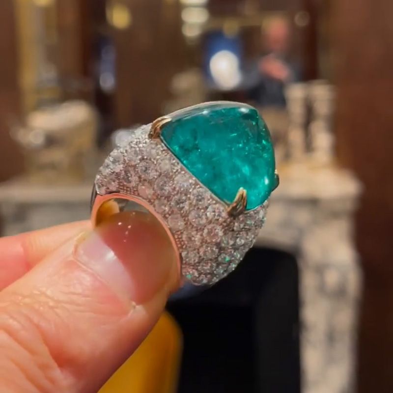 Ella 10.5ct Sugar Loaf Cabochon Emerald Paved Two-Tone Handmade Sterling Silver Ring